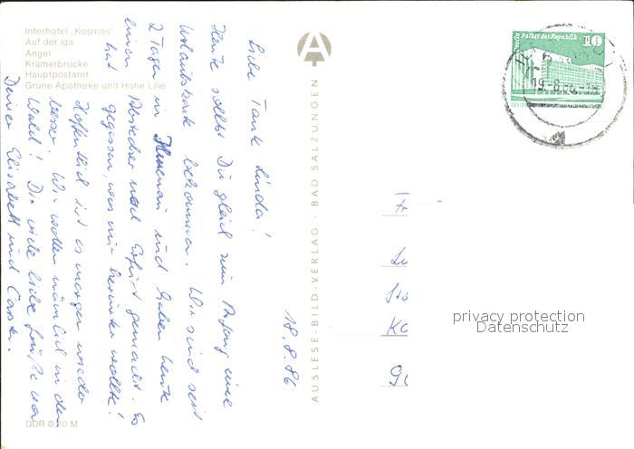 72321487 alte Postkarte ERFURT CITY Interhotel Kosmos Anger Kraemerbruecke Hauptpostamt postalisch gelaufen Erhaltung siehe scans KatCode: 11110016051000