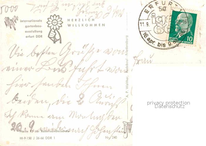 72749732 alte Postkarte ERFURT CITY Internationale Gartenbauausstellung Rosensonderschau postalisch gelaufen Erhaltung siehe scans [KathaD81] KatCode: 11110016051000