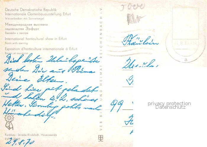 72749727 alte Postkarte ERFURT CITY Internationale Gartenbauausstellung Wasserbecken Sonnensegel postalisch gelaufen Erhaltung siehe scans [KathaD81] KatCode: 11110016051000