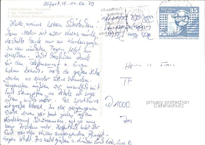72290765 alte Postkarte ERFURT CITY Kraemerbruecke Iga Volkssternwarte Restaurant Hoehe Lilie postalisch gelaufen Erhaltung siehe scans KatCode: 11110016051000