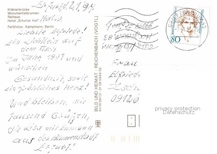 72616271 alte Postkarte ERFURT CITY Kraemerbruecke Monumentalbrunnen Rathaus Hotel Erfurter Hof postalisch gelaufen Erhaltung siehe scans [FriedD77] KatCode: 11110016051000