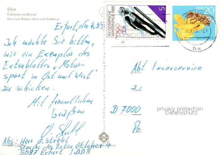 73059961 alte Postkarte Erfurt Fischmarkt mit Roland Haus zum Breiten Herd Gildenhaus postalisch gelaufen Erhaltung siehe scans [WerneD78] KatCode: 11110016051000