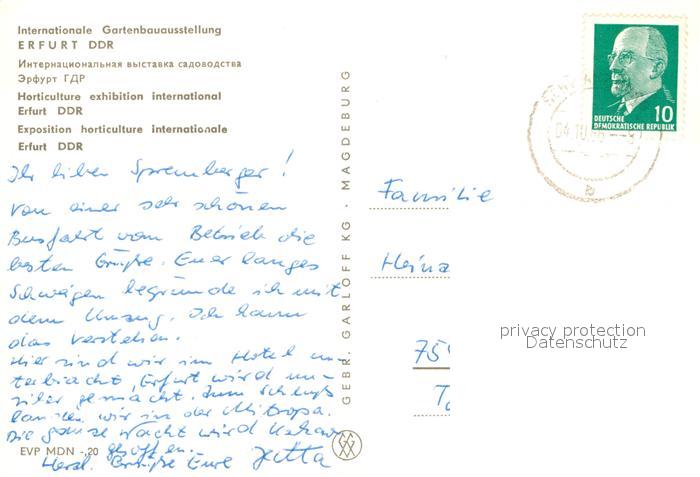 72984065 alte Postkarte Erfurt Internat Gartenbauausstellung postalisch gelaufen Erhaltung siehe scans [WerneD78] KatCode: 11110016051000