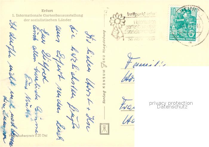 73204409 alte Postkarte Erfurt Internationale Gartenbauausstellung der sozialistischen Laender postalisch gelaufen Erhaltung siehe scans [FriedD77] KatCode: 11110016051000