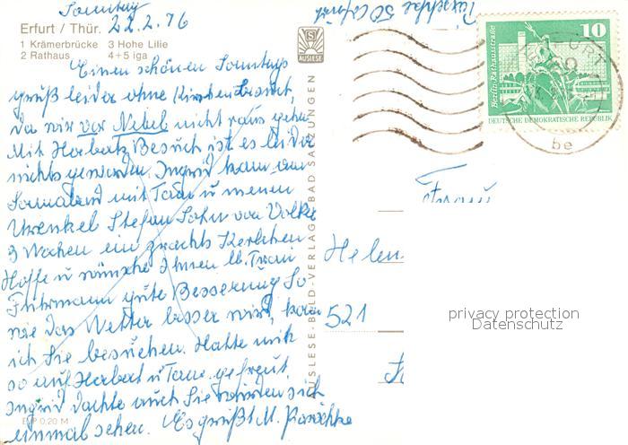 73146035 alte Postkarte Erfurt Kraemerbruecke Hohe Lilie Historisches Gebaeude Rathaus iga Gartenbauausstellung postalisch gelaufen Erhaltung siehe scans [FriedD77] KatCode: 11110016051000