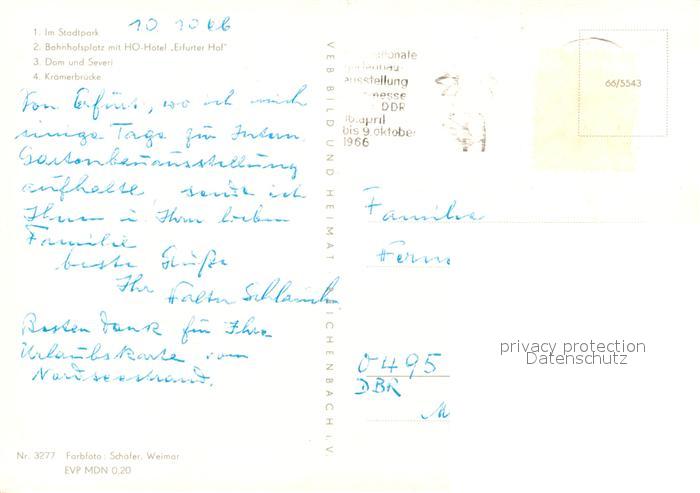 73019259 alte Postkarte Erfurt Stadtpark Bahnhofsplatz mit HO Hotel Erfurter Hof Dom und Severi Kraemerbruecke postalisch gelaufen Erhaltung siehe scans [WerneD78] KatCode: 11110016051000