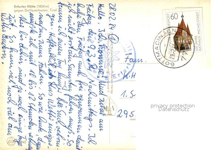 73721666 alte Postkarte Erfurterhuette 1834m Tirol mit Dalfazerkamm postalisch gelaufen Erhaltung siehe scans [WerneD78] KatCode: 11390335070907
