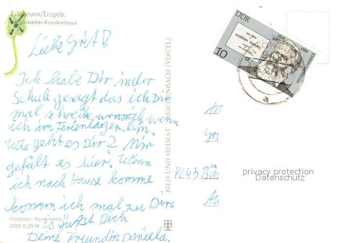 73063855 alte Postkarte Erlabrunn Erzgebirge Bergarbeiter Krankenhaus postalisch gelaufen Erhaltung siehe scans [FriedD77] KatCode: 11110014191090