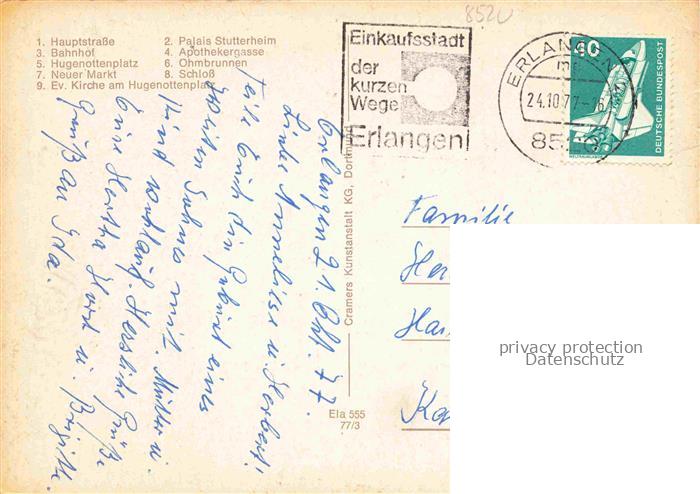 74049778 ERLANGEN Bayern Hauptstrasse Bahnhof Hugenottenplatz Markt Kirche Palais Gasse Brunnen Schloss postalisch gelaufen Erhaltung siehe scans [FriedD77] alte Postkarte Frie Katcode 11110009562000