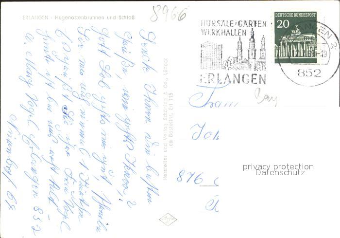 72131468 alte Postkarte ERLANGEN Bayern Hugenottenbrunnen und Schloss postalisch gelaufen Erhaltung siehe scans KatCode: 11110009562000