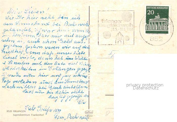72751897 alte Postkarte ERLANGEN Bayern Jugendzentrum Frankenhof postalisch gelaufen Erhaltung siehe scans [KathaD81] KatCode: 11110009562000