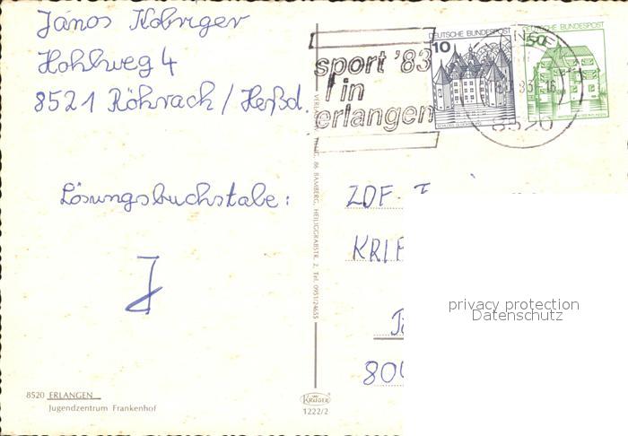 72035624 alte Postkarte ERLANGEN Bayern Jugendzentrum Frankenhof postalisch gelaufen Erhaltung siehe scans KatCode: 11110009562000
