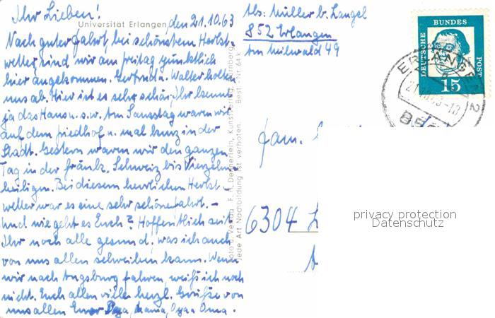 72693052 alte Postkarte ERLANGEN Bayern Schloss Hugenottenbrunnen Kunstbrunnen Platz Schlossgarten Universitaet Marktplatz Bahnhof Heilanstalt Uniklinik postalisch gelaufen Erhaltung siehe scans [FriedD77] KatCode: 11110009562000