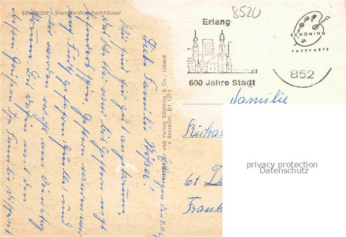 74049837 ERLANGEN Bayern Siemens-Wohnhochhaeuser postalisch gelaufen Erhaltung siehe scans [FriedD77] alte Postkarte Frie Katcode 11110009562000