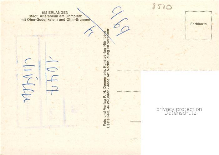 73830000 ERLANGEN Bayern Staedt Altersheim am Ohmplatz mit Ohm Gedenkstein und Ohm Brunnen postalisch nicht gelaufen Erhaltung siehe scans [WerneD78] Wern Katcode 11110009562000
