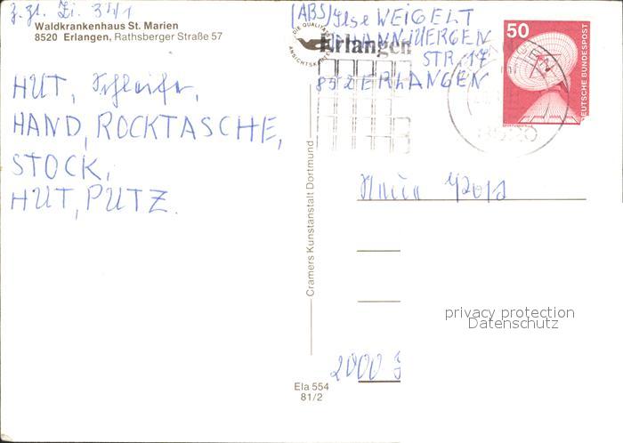 72071686 alte Postkarte ERLANGEN Bayern Waldkrankenhaus St Marien postalisch gelaufen Erhaltung siehe scans KatCode: 11110009562000