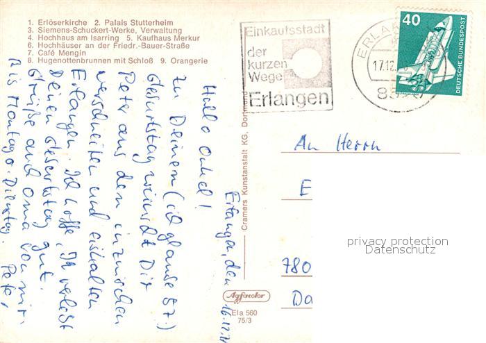 73512259 alte Postkarte Erlangen Erloeserkirche Palais Stutterheim Hochhaus Isarring Kaufhaus Merkur Hochhaeuser Friedr Bauer Strasse Cafe Mengin Hugenottenbrunnen mit Schloss Orangerie postalisch gelaufen Erhaltung siehe scans [WerneD78] KatCode: 11110009562000