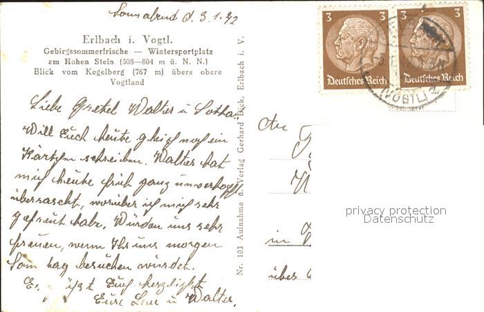 71867717 alte Postkarte Erlbach Vogtland Blick vom Kegelberg Sommerfrische Wintersportplatz postalisch gelaufen Erhaltung siehe scans KatCode: 11110014178160