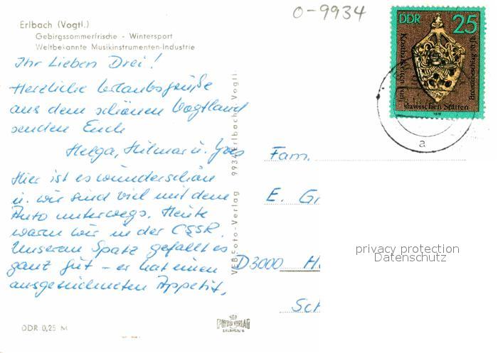72917973 alte Postkarte Erlbach Vogtland Eubabrunner Tal mit Hohem Stein Landesgemeindetal Lindenhoehe Kegelbergblick postalisch gelaufen Erhaltung siehe scans [WerneD78] KatCode: 11110014178160