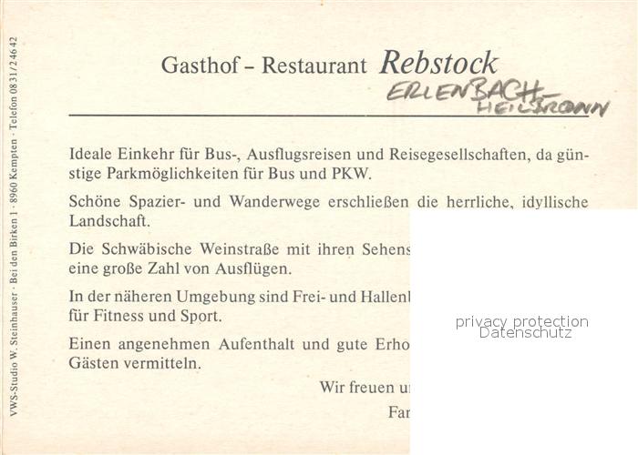 73090495 Erlenbach Heilbronn Gasthof Rebstock postalisch nicht gelaufen Keine Postkarte (siehe scan) Erhaltung siehe scans [NatalD47] KatCode: 11110008125027