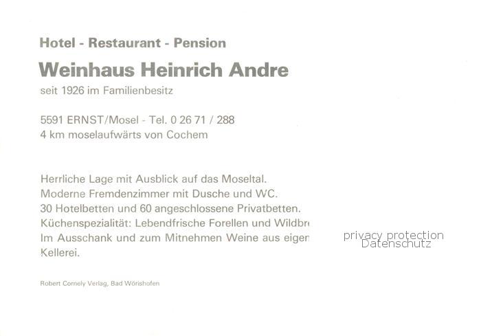73862895 Ernst Cochem Hotel Restaurant Weinhaus Heinrich Andre Gastraeume Terrasse postalisch nicht gelaufen Werbekarte (keine Postkarte) Erhaltung siehe scans [WerneD78] KatCode: 11110007135027