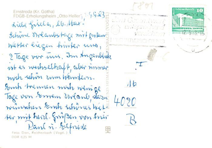 73907622 alte Postkarte Ernstroda FDGB Erholungsheim Otto Heller postalisch gelaufen Erhaltung siehe scans [FriedD77] KatCode: 11110016067015