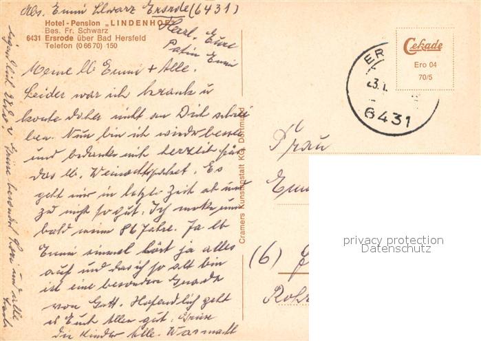 73646008 alte Postkarte Ersrode Hotel Pension Lindenhof postalisch gelaufen Erhaltung siehe scans [FriedD77] KatCode: 11110006632012