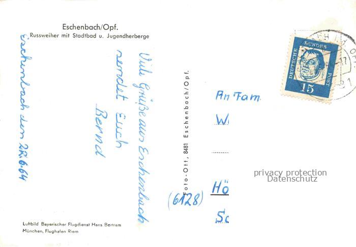 74109928 alte Postkarte Eschenbach Oberpfalz Neustadt Waldnaab Bayern Russweiher mit Stadtbad und Jugendherberge Fliegeraufnahme postalisch gelaufen Erhaltung siehe scans [WerneD78] KatCode: 11110009374117