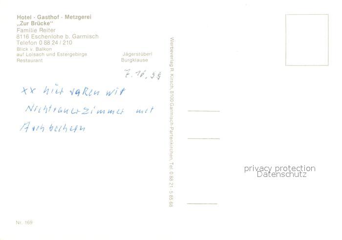73662292 Eschenlohe Hotel Gasthof Metzgerei Zu Bruecke Restaurant Panorama Blick auf Loisach und Estergebirge postalisch nicht gelaufen Erhaltung siehe scans [FriedD77] KatCode: 11110009180114
