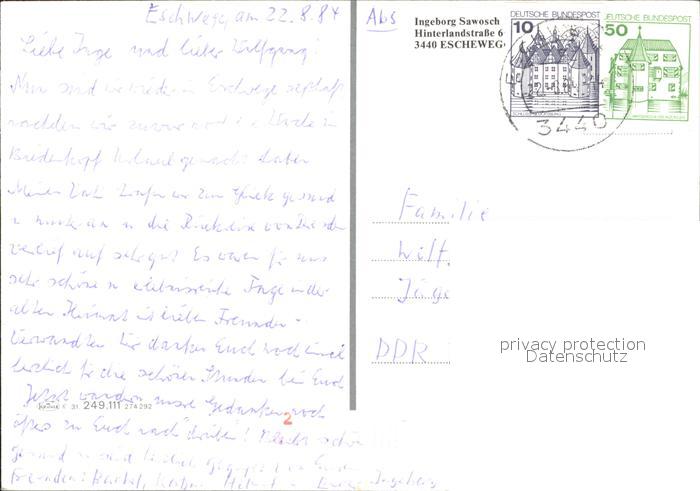 72357790 alte Postkarte Eschwege Schloss Stadthalle Fachwerkbauten Markt Nicolaiturm postalisch gelaufen Erhaltung siehe scans KatCode: 11110006636003
