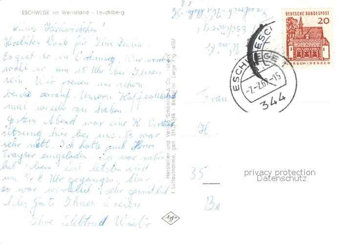 73167343 alte Postkarte Eschwege Werratal mit Leuchtberg Fliegeraufnahme postalisch gelaufen Erhaltung siehe scans [FriedD77] KatCode: 11110006636003