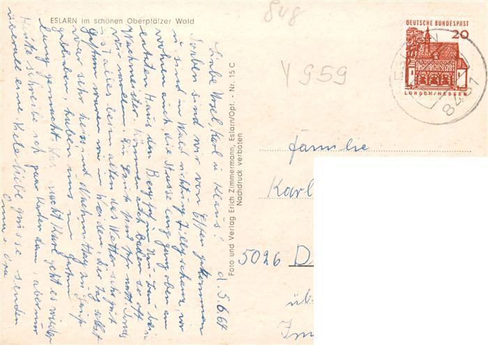 73870365 alte Postkarte Eslarn Rathaus Marktplatz Gesamtansicht Tillyplatz Torfhaeusl Freibad Landesgrenze Tillyschanze postalisch gelaufen Erhaltung siehe scans [FriedD77] KatCode: 11110009374118