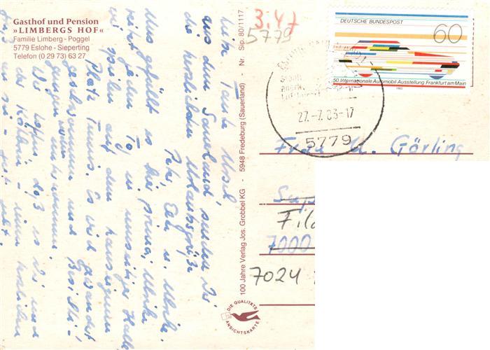73942806 alte Postkarte Eslohe Sauerland Gasthof Pension Limbergs Hof Gaststube Panorama Reithalle postalisch gelaufen Erhaltung siehe scans [WerneD78] KatCode: 11110005958016