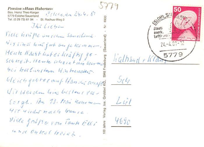 73894339 alte Postkarte Eslohe Sauerland Pension Haus Hubertus Gastraeume Panorama postalisch gelaufen Erhaltung siehe scans [WerneD78] KatCode: 11110005958016