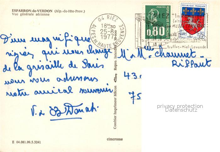 13585379 Esparron-de-Verdon Fliegeraufnahme postalisch gelaufen Erhaltung siehe scans [KathaD81] carte postale Kath Katcode 11170004304081