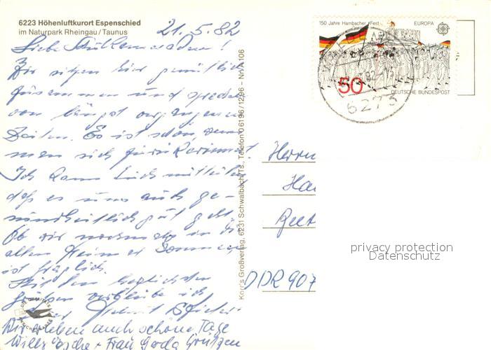 73673283 alte Postkarte Espenschied Fliegeraufnahme Hoehenluftkurort Landschafspanorama Wispertal Wegweiser Fachwerkhaus postalisch gelaufen Erhaltung siehe scans [FriedD77] KatCode: 11110006439010