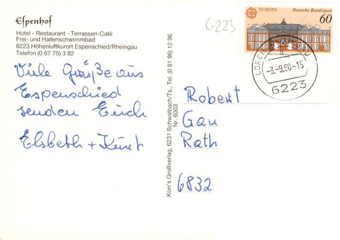73935977 alte Postkarte Espenschied Lorch Hotel Restaurant Espenhof Gastraum Bar Hallenbad Terrasse postalisch gelaufen Erhaltung siehe scans [FriedD77] KatCode: 11110006439010