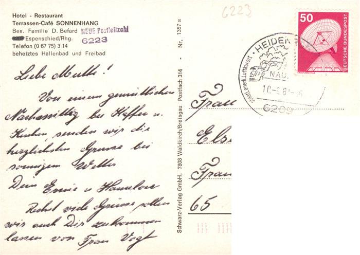 73935904 alte Postkarte Espenschied Lorch Hotel Restaurant Terrassencafe Sonnenhang Liegewiese Gaststube postalisch gelaufen Erhaltung siehe scans [FriedD77] KatCode: 11110006439010