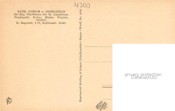 73691983 Essen Ruhr Aula Fluegel Katholisches Lyzeum und Oberlyzeum der Reg. Chorfrauen des hl. Augustinus postalisch nicht gelaufen Erhaltung siehe scans [FriedD77] KatCode: 11110005113000