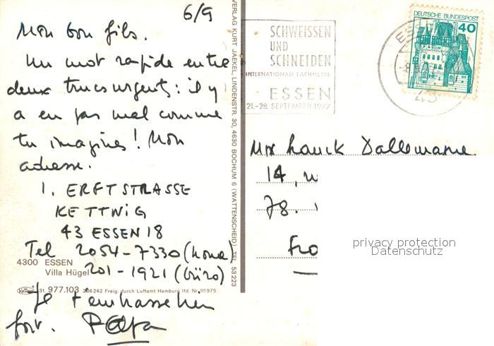 73167888 alte Postkarte Essen Ruhr Fliegeraufnahme Villa Huegel postalisch gelaufen Erhaltung siehe scans [LiesaD40] KatCode: 11110005113000