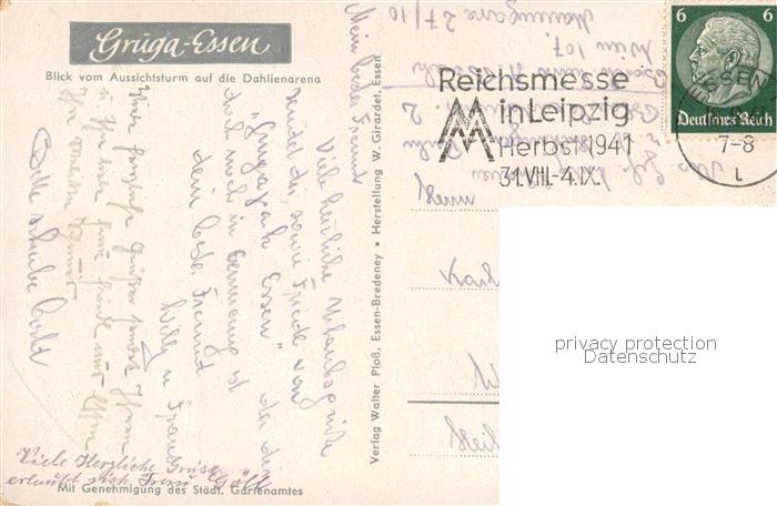 73772729 alte Postkarte Essen Ruhr Gruga Park Blick vom Aussichtsturm auf die Dahlienarena postalisch gelaufen Erhaltung siehe scans [FriedD77] KatCode: 11110005113000