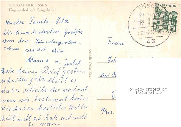 72881981 alte Postkarte Essen Ruhr Grugapark Eingangshof mit Grugahalle postalisch gelaufen Erhaltung siehe scans [FriedD77] KatCode: 11110005113000