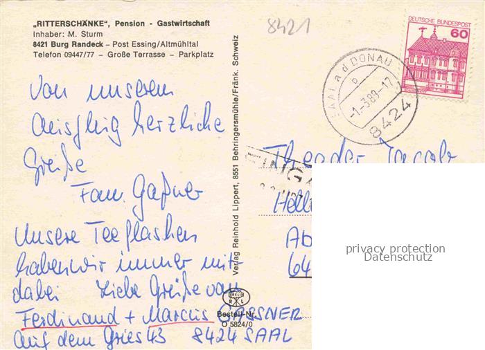 74049306 alte Postkarte Essing Burg Randeck Ritterschaenke Pension Gastwirtschaft postalisch gelaufen Erhaltung siehe scans [FriedD77] KatCode: 11110009273121