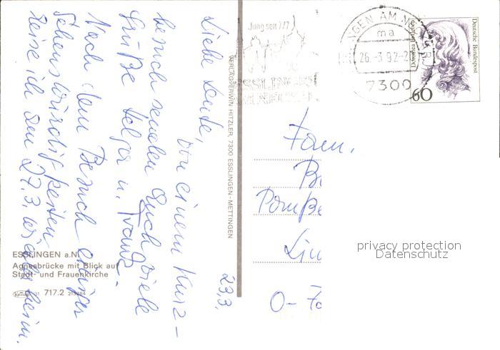72356069 alte Postkarte Esslingen Neckar Agnesbruecke Stadtkirche Frauenkirche postalisch gelaufen Erhaltung siehe scans KatCode: 11110008116019