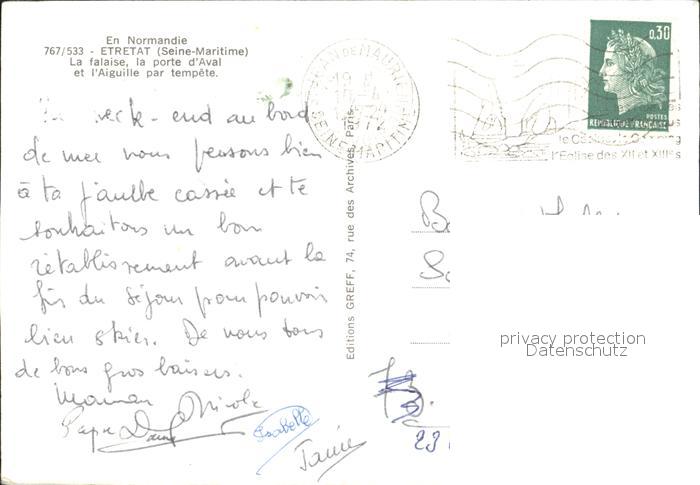 12233043 carte postale Etretat La falaise la porte d Aval et l’Aiguille par tempete postalisch gelaufen Erhaltung siehe scans KatCode: 11170076276254