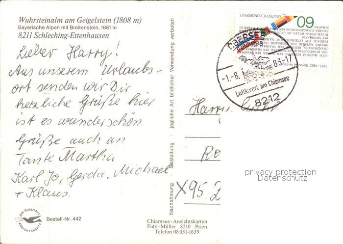 71892323 alte Postkarte Ettenhausen Schleching Wuhrsteinalm am Geigelstein Bayerische Alpen Breitenstein postalisch gelaufen Erhaltung siehe scans KatCode: 11110009189141