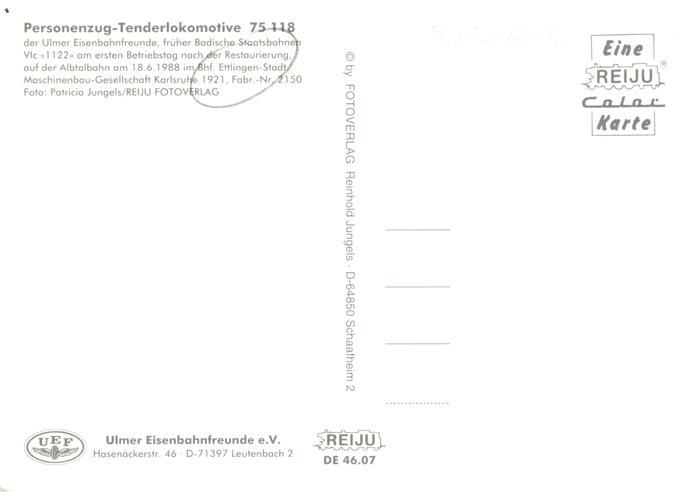 73938334 Ettlingen Personenzug Tenderlokomotive 75 118 postalisch nicht gelaufen Erhaltung siehe scans [WerneD78] KatCode: 11110008215017
