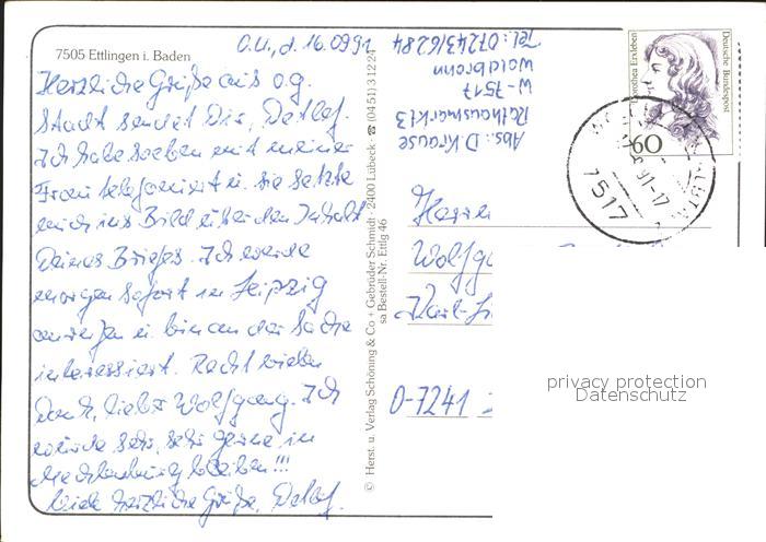 72357791 alte Postkarte Ettlingen Plastiken Statue Kirche Schloss Rathaus Gaststaette Fachwerkhaus postalisch gelaufen Erhaltung siehe scans KatCode: 11110008215017