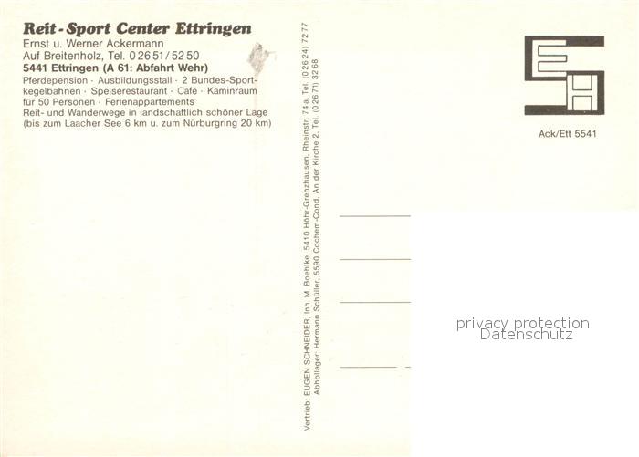 73648785 Ettringen Eifel Reit Sport Center Ettringen Pferdepension Speiserestaurant Cafe Kaminzimmer Kegelbahnen postalisch nicht gelaufen Erhaltung siehe scans [WerneD78] KatCode: 11110007137025