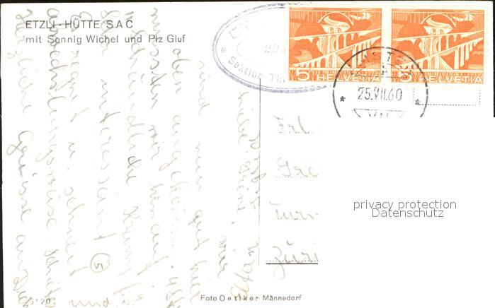 11853283 alte Postkarte Etzlihuette mit Sonnig Wichel und Piz Giuf postalisch gelaufen Erhaltung siehe scans KatCode: 11470360530658